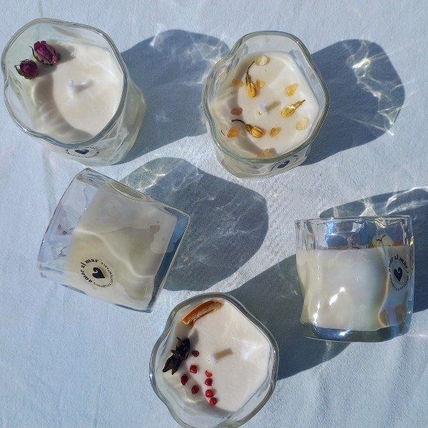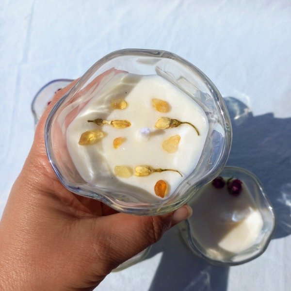 Envase de vidrio irregular tornasol. Decorada con pimpollos de jazmín del pais deshidratados y mini cristales (cuarzo citrino)