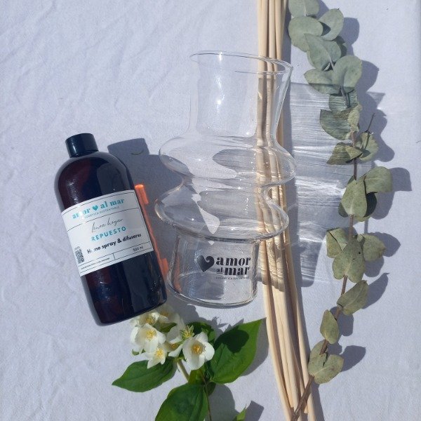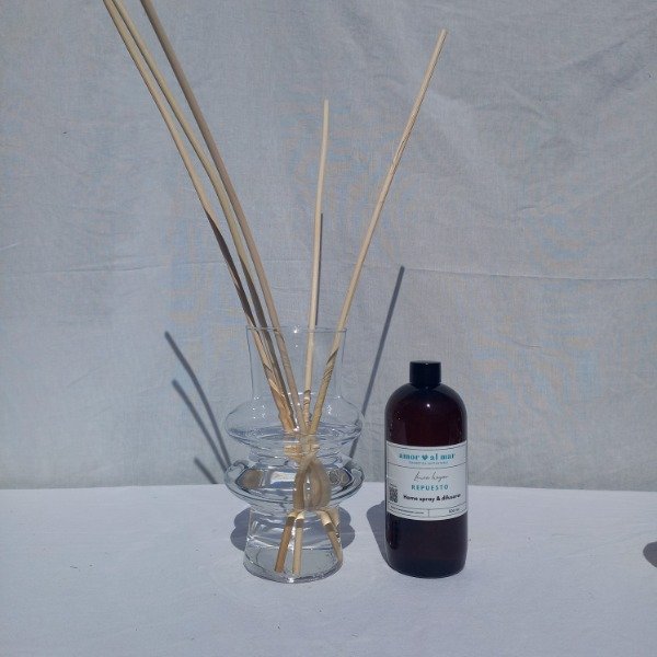 Difusor ambiental en envase de vidrio XXL (21cm alto 8cm diámetro) + 5 varillas de ratan XL y envase con fragancia a elección x 500 ml