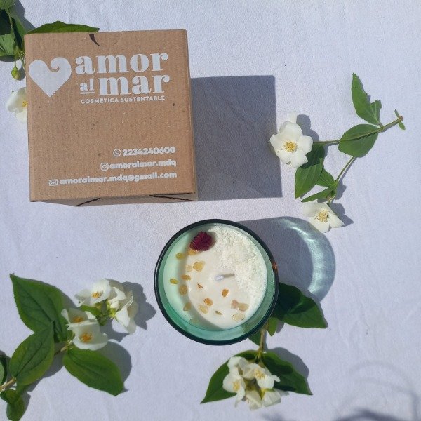 Vela de soja vertida a mano, dexorada con cuarzo citrino, pimpollos de rosa deshidratados y coco
