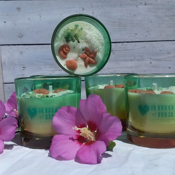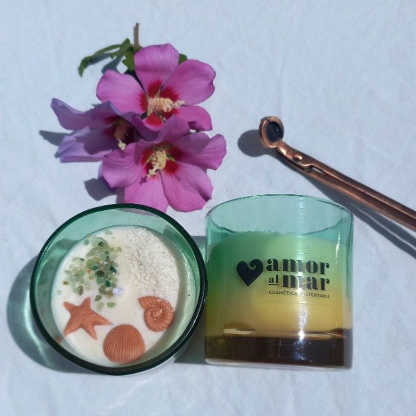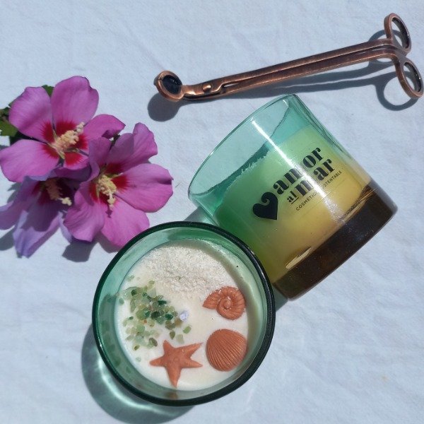 Vela de soja vertoda a mano, decorada con cristales en bruto, frutas y flores deshidratadas