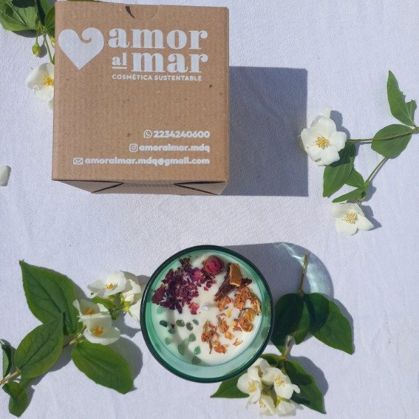 Vela de soja vertida a mano, decorada con cristales, flores y frutas deshidratadas.