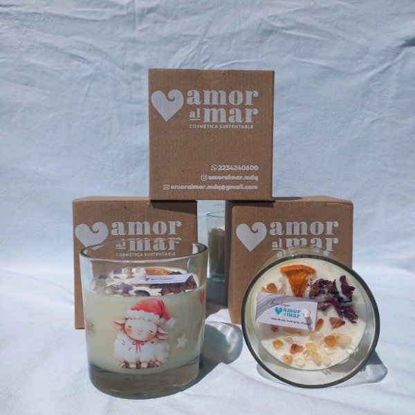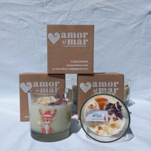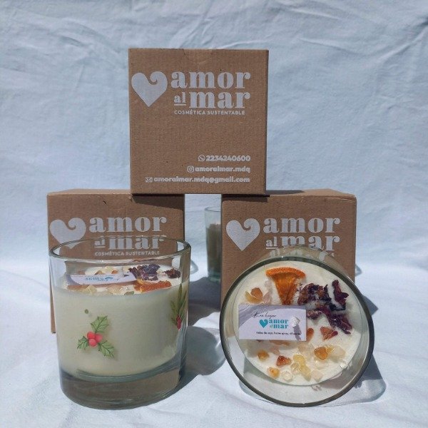 Velas aromáticas artesanales, 100% cera de soja con pabilo de algodón sin encerar que permite un quemado mucho más limpio y permite una mejor volatilidad de las esencias. Decoradas con pétalos de flores, cítricos deshidratados y piedras.