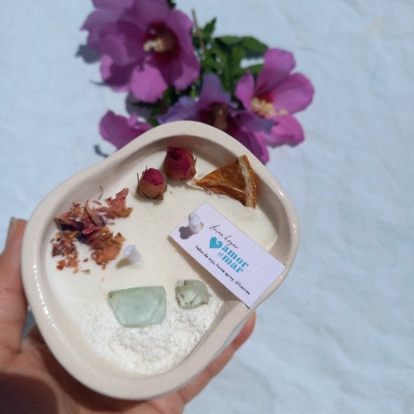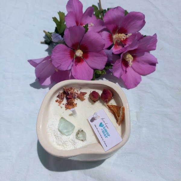 Vela de soja en recipiente de cerámica artesanal, con dos pabilos.