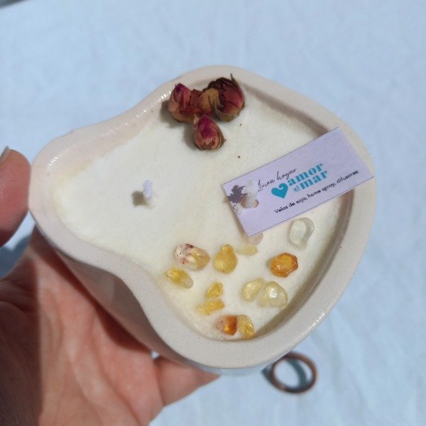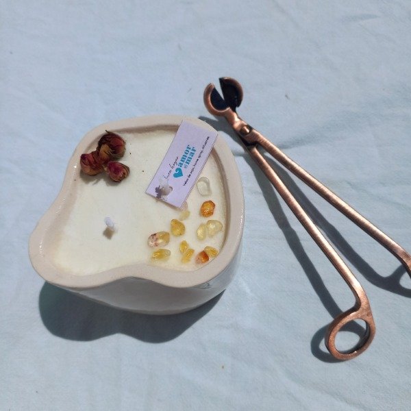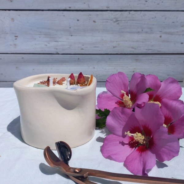 Vela de soja en recipiente de cerámica artesanal, con dos pabilos.