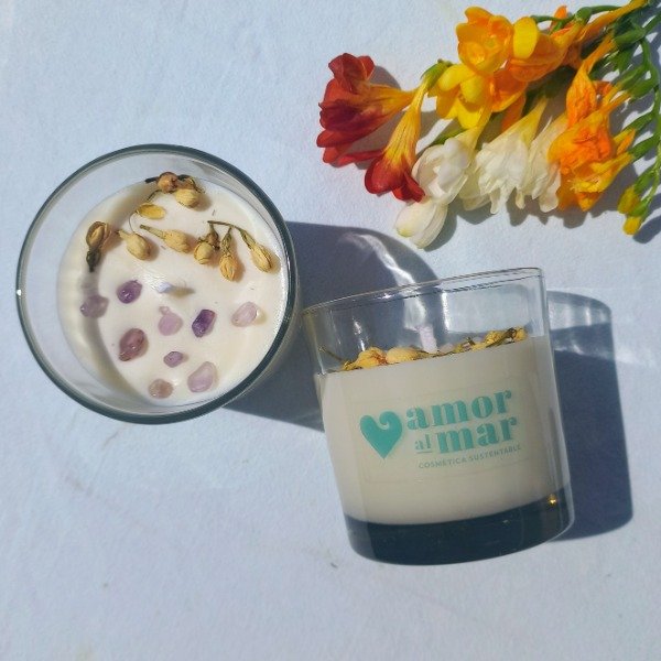Vela de soja vertoda a mano, decorada con jazmínes deshidratados y amatista