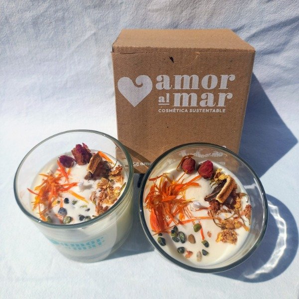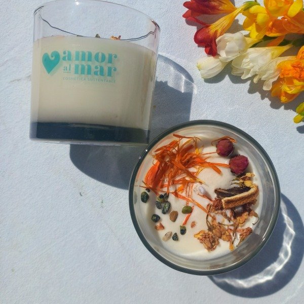 Vela de soja vertida a mano, decorada con cristales, flores y frutas deshidratadas.