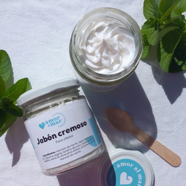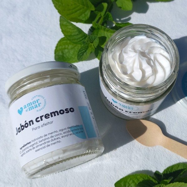 Jabón cremoso batido especial para afeitar, enriquecido con aceite de almendras dulces y aceite esencial de menta piperita.
